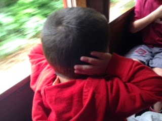 | Seuss covered his ears when he heard the train whistle. Last year on this ride, Leo freaked out over the train whistle. This year,he hardly commented. We’ve come a long way! |