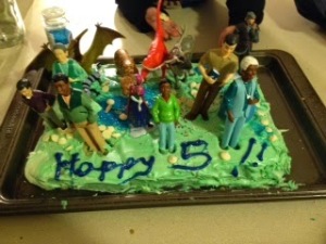 Well, tonight I present to you my favorite cake effort to date. There are dinosaurs, Frozen characters, a cheetah, and dolls from our dollhouse. Not to mention heavy servings of blue sprinkles, chocolate chips, and rainbow sprinkles. Do your teeth hurt looking at it? It’s perfect, isn’t it?