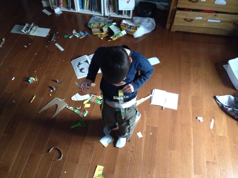 I get a ridiculous amount of paper in the mail and in my children’s backpacks (Note: have you heard of Paperkarma? It’s a free app to cut down on snail mail). Most of the paper I receive is blank on one side so we reuse it for art. I save shoe boxes, paper towel and toilet paper rolls, and cardboard for projects. The kids also have access to our recycling bin.